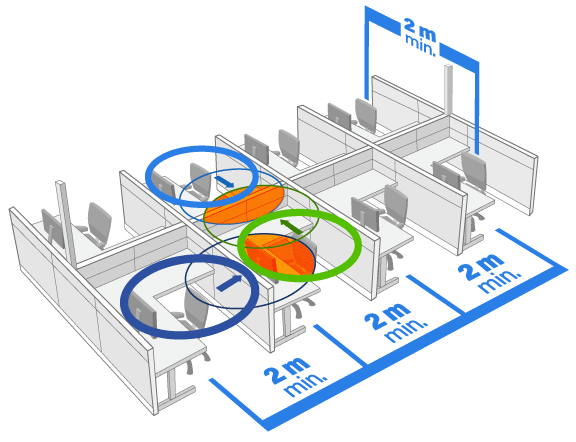 Public Services and Procurement Canada (2020) have developed a “Guidance and practices for the safe return to workplaces in light of the easing restrictions” document. When assessing the workstation layout, be sure to measure for 2 metres distance in all directions, measured from where the individual would sit.