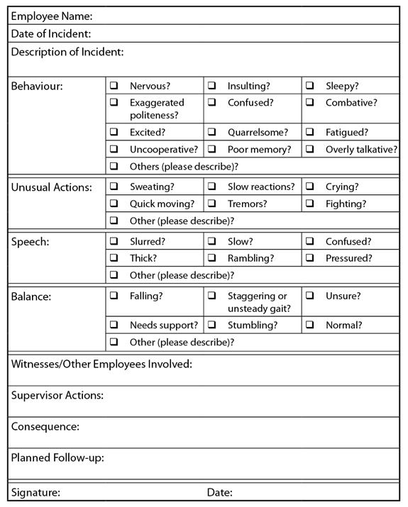 - If necessary, call a taxi or have employee escorted home. Do not allow them to drive if you suspect impairment.