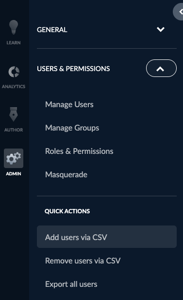 To start, go to the Admin section under the Application Switcher. From there, click on Users & Permissions, and in the sub-menu that appears, click on Manage Groups.