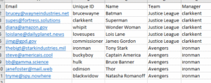As you can see above, we’ve included email addresses for everyone, given everyone a “Unique ID,” or username, and included the custom field for “Team.” Please disregard the “Manager” column, as this is not applicable to CSV uploads.