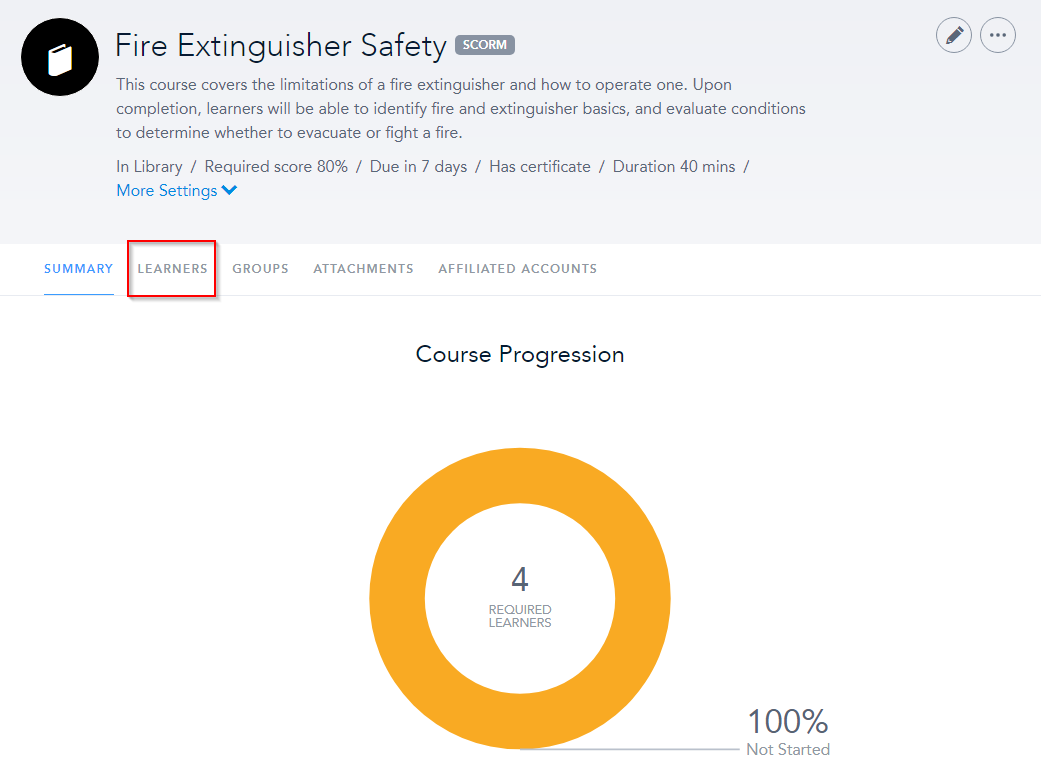 To make any changes, you’ll need to find the course. First, go to the Author tab and search for the course you wish to preview. Once you find it, click the name of the course to be brought to the main course page. From there, click Learners.