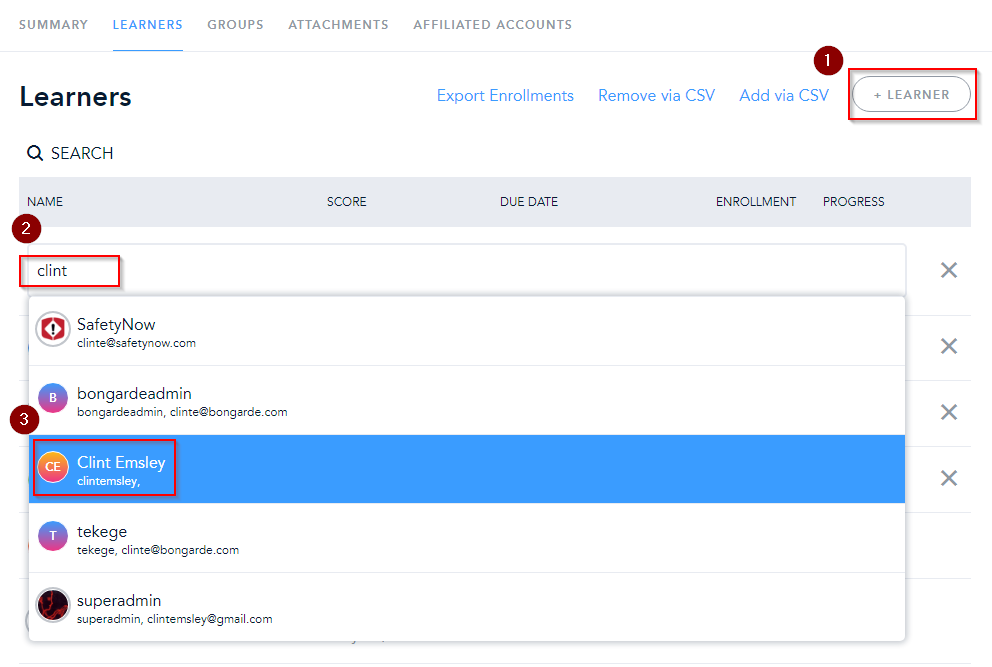 Click on Learners and you will be presented with a list of everyone already enrolled in the course. To enroll a new person, click on + Learner in the upper right, and type their name into the box that appears. Once you find the person you are looking for, click on their name in the dropdown.