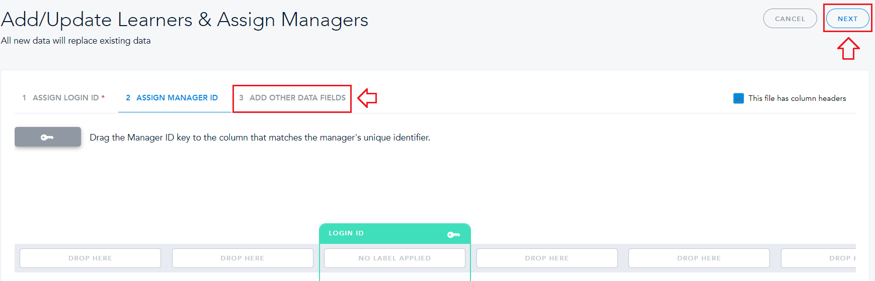Next, you’ll be asked to drag the Manager ID Key to the appropriate column. Please skip this step, by clicking the blue “Next” button in the upper right corner, or by clicking on the “3 Add Other Data Fields” button, as shown below.