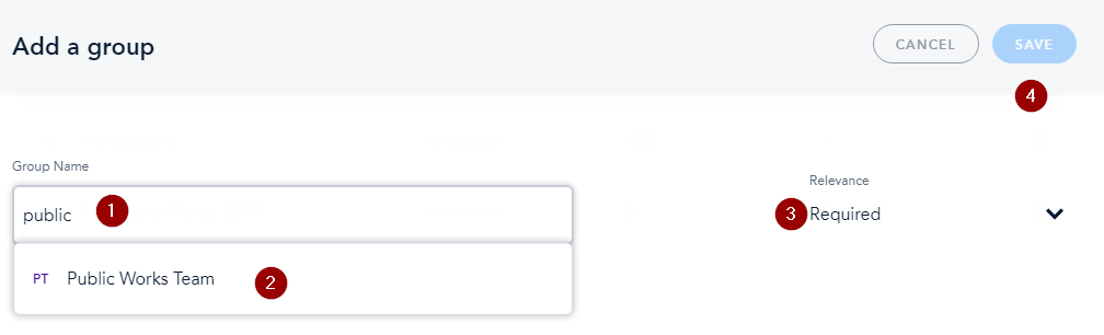 This will open up a window allowing you to search for an existing group. Type in the beginning of the group name and it will automatically pop up below. Click on that group to add it. You’ll then decide a relevance by clicking on the dropdown on the right side. If you want them to take it, then change this to Required. Finally, click Save.