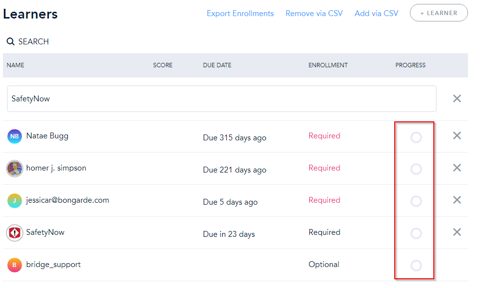If a learner has not completed a course, you can manually pass them. This will set their status to Complete and use today’s date as the passing date. To do so, click the circle in the progress column for a user who has not passed the course yet, as pictured below: