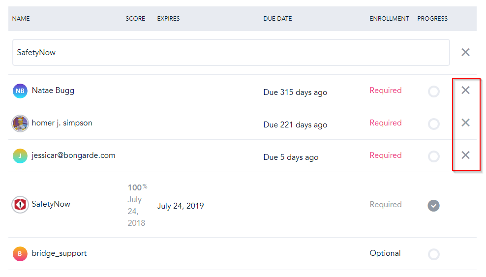 If a learner is required to take a course, i.e. they did not sign up for it themselves, and they have not completed it yet, you can remove their enrollment. This is as simple as clicking the X in the final column, as pictured below: