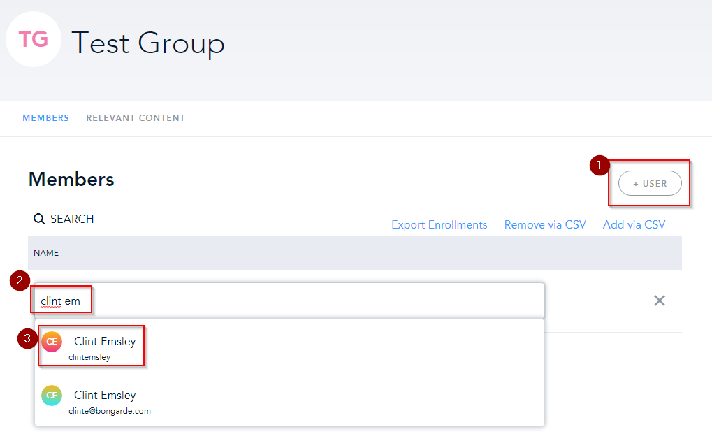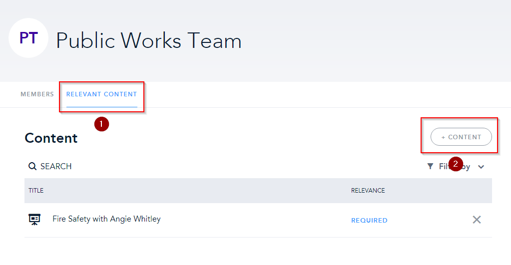 In the list of groups that appears, click on the name of the group you want to assign courses to. From there, you’ll be brought to a page showing all the members of the group. To start assigning courses, click Relevant Content at the top. To assign a course, click +Content in the upper right.