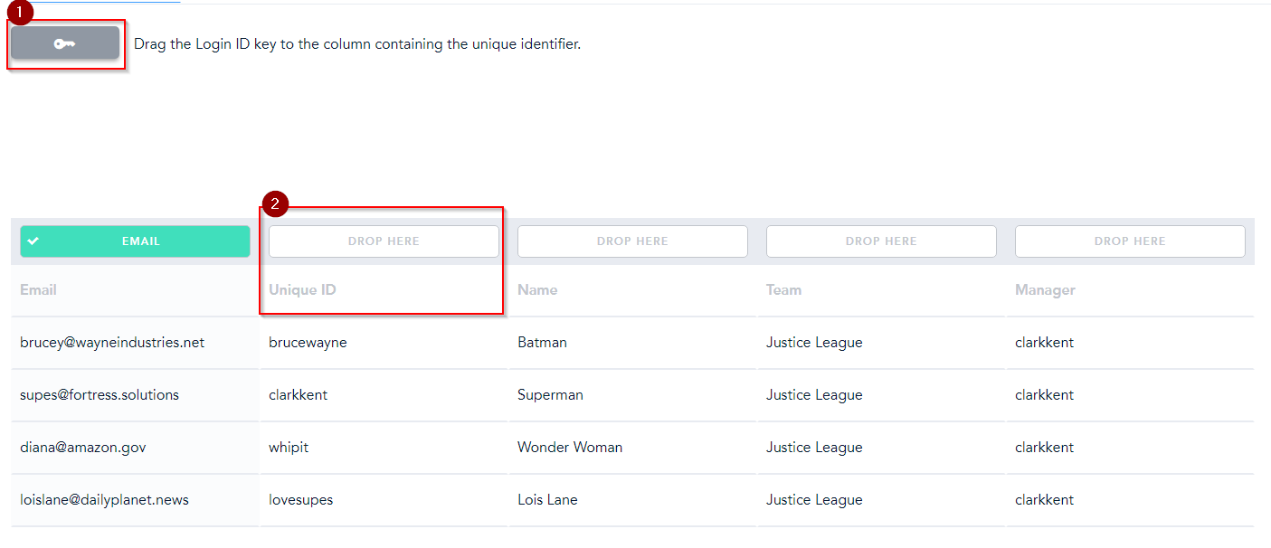 The first step is to drag the Login ID Key [1] to the field with your Usernames [2], or to the email field if everyone has an email. Just click and drag it to the top of the appropriate column.
