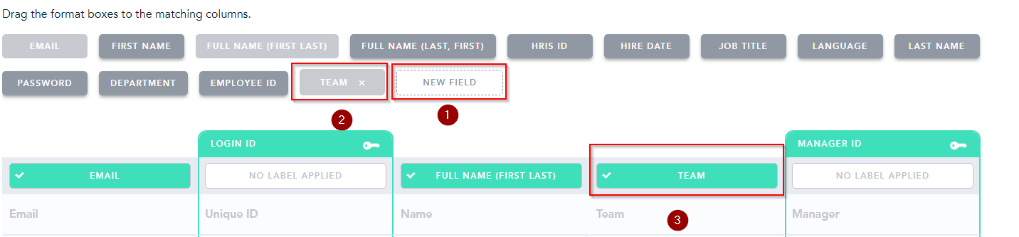 However, we don’t have anything for Team. That’s okay, we can just create a New Field! First, click New Field, then type in the appropriate name, and finally drag it over to the correct column, as seen below: