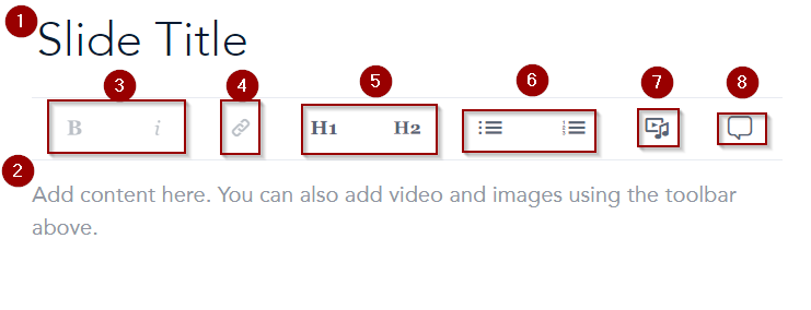 - This is where you’ll type the content of the slide, as well as add images, videos, etc.