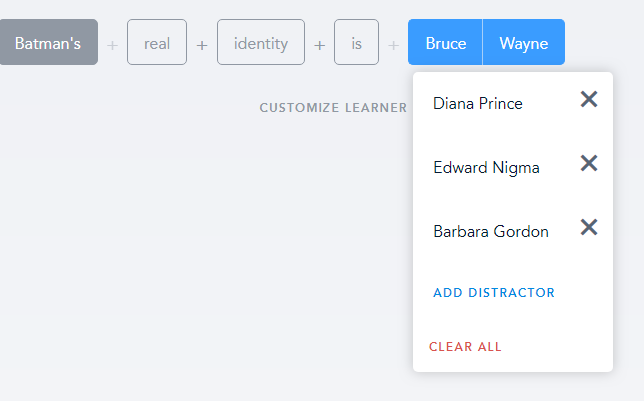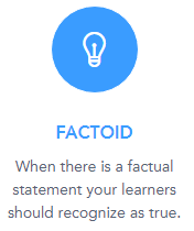 Factoids are a fun way of generating lots of questions with little information. First, you type in a fact that you want a learner to know. From there, you will type in “distractor words” to replace the various words in the fact you just typed. These words will then be used to create a pool of questions challenging learners to spot untrue facts, fill in the blanks, and more. Here’s an example: