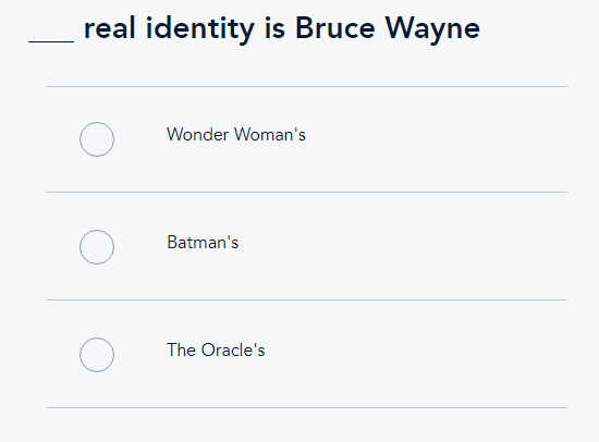 As you can see above, we’ve generated distractor words for multiple words/phrases in the fact, which will generate a large pool of questions! Here’s an example question: