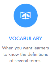 When you make a vocabulary quiz, you will write the definition of 2 or more words you want the learner to know. 3-4 is the ideal number so that the quiz pool is large, but not too bulky for you to write. Once you’ve provided this info, the system will generate a pool of questions challenging learners to match words with their correct definitions, fill in the blanks, or answer true/false questions.