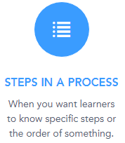Steps in a Process quizzes will ask you to lay out the order of a process. 3-5 steps is usually sufficient, but it can be as large as you want. The questions generated will have learners filling in blanks in the process, answering multiple choice questions about what step goes where, and more.