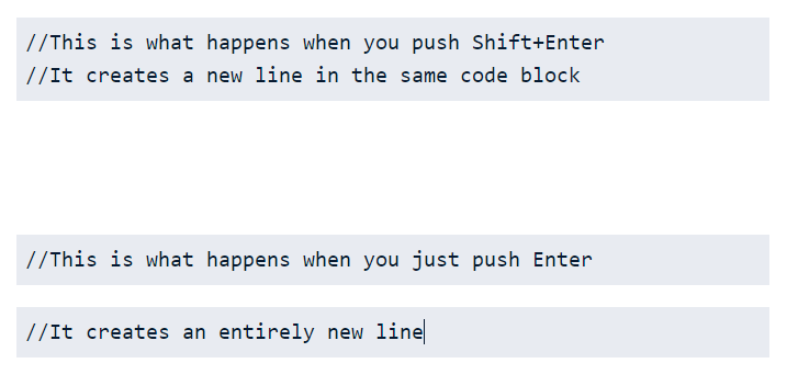 Hitting Enter will make a new code block, while hitting Shift+Enter will lengthen the existing code block, as seen below: